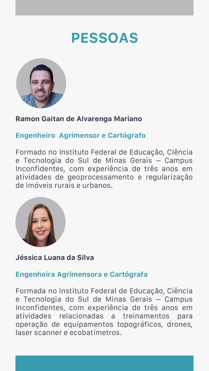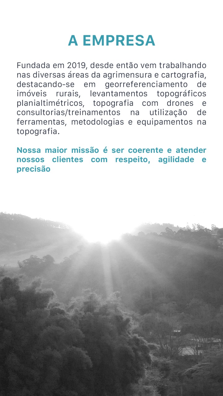 Bio: Fundada em 2019, desde então vem trabalhando nas diversas áreas da agrimensura e cartografia, destacando-se em georreferenciamento de imóveis rurais, levantamentos topográficos planialtimétricos, topografia com drones e consultorias/treinamentos na utilização de ferramentas, metodologias e equipamentos na topografia.